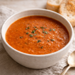 This creamy tomato basil soup is smooth, comforting, and made with simple pantry ingredients. It comes together easily on the stovetop and delivers rich tomato flavor balanced with just the right amount of cream and basil. A reliable, family-friendly soup that works equally well for a cozy lunch or an easy dinner, especially when paired with grilled sandwiches or crusty bread.