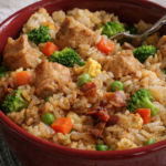 - Cook the rice according to package directions and set aside. Using slightly cooled or day-old rice works best.In a large skillet or pan, cook diced bacon over medium heat until crisp. Remove excess grease if needed.Add chopped onion and bell pepper to the bacon and cook until softened.Stir in the cooked chicken and soy sauce. Heat through.In a separate pan, scramble the eggs with salt and pepper to taste.Add the cooked rice, scrambled eggs, and vegetables to a very large bowl or skillet.Toss everything together until well combined and evenly heated. Adjust soy sauce as needed.Serve warm.