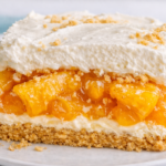 - Prepare the peach layer:In a medium saucepan, whisk together water, granulated sugar, and cornstarch. Cook over medium heat, stirring frequently, until thickened. Remove from heat and stir in gelatin until fully dissolved. Fold in peaches and set aside to cool.Make the crust:In a bowl, combine crushed graham crackers, melted butter, and powdered sugar. Press about two-thirds of the mixture firmly into the bottom of a 9×13-inch pan. Refrigerate for 10 minutes to set.Assemble the peach layer:Carefully spoon the cooled peach mixture over the crust. Spread evenly. Refrigerate for 3–4 hours, or until fully set.Prepare the cream topping:In a mixing bowl, beat cream cheese and powdered sugar until smooth. Gently fold in whipped topping until light and fluffy.Finish the dessert:Spread the cream topping evenly over the peach layer. Sprinkle the remaining graham cracker crumbs on top. Refrigerate until ready to serve.Prepare the peach layer:In a medium saucepan, whisk together water, granulated sugar, and cornstarch. Cook over medium heat, stirring frequently, until thickened. Remove from heat and stir in gelatin until fully dissolved. Fold in peaches and set aside to cool.Make the crust:In a bowl, combine crushed graham crackers, melted butter, and powdered sugar. Press about two-thirds of the mixture firmly into the bottom of a 9×13-inch pan. Refrigerate for 10 minutes to set.Assemble the peach layer:Carefully spoon the cooled peach mixture over the crust. Spread evenly. Refrigerate for 3–4 hours, or until fully set.Prepare the cream topping:In a mixing bowl, beat cream cheese and powdered sugar until smooth. Gently fold in whipped topping until light and fluffy.Finish the dessert:Spread the cream topping evenly over the peach layer. Sprinkle the remaining graham cracker crumbs on top. Refrigerate until ready to serve.